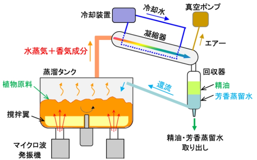 電子レンジの要領で、素材に直接マイクロ波を照射し均一かつ精密に加熱することで、高品質の香り成分を抽出することができる装置。